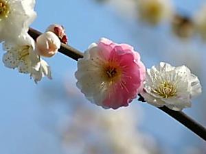 梅 こんな梅の花もあるのですね。 八重咲きの源平咲きを見つけました。 傍題=梅林、梅園、野梅、臥竜梅 など |