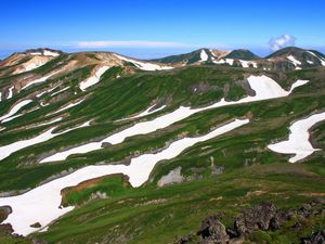 残 雪 もう草の生えてきたところと、斑になって雪 が残っています。 山の斜面の微妙な凹凸がこんな風景をつくる のですね。 傍題=残る雪、雪残る |
